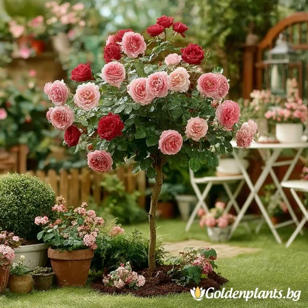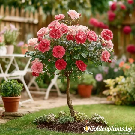Елегантен сорт с компактна корона и множество кичести цветове в нежни розови и прасковени нюанси. Цъфти продължително през целия сезон и създава силен акцент във всяка градина или алея. Подходяща е за засаждане самостоятелно, в групи или в декоративни съдове.
